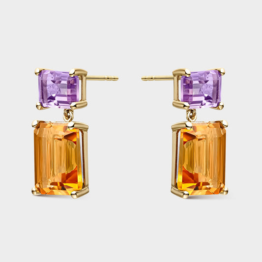PENDIENTES DE ORO AMARILLO DE 18KTS CON 2 CITRINOS OCTOGONALES DE 10X8MM Y 2 AMATISTAS BAGUETTE DE 7X5MM