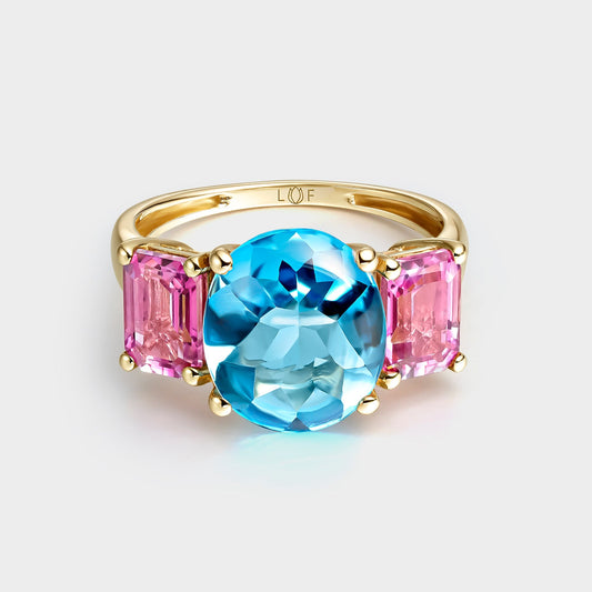 ANILLO ORO AMARILLO 18K COCKTAIL CABUJÓN TOPACIO SWISS Y TOPACIO ROSA BAGUETTE