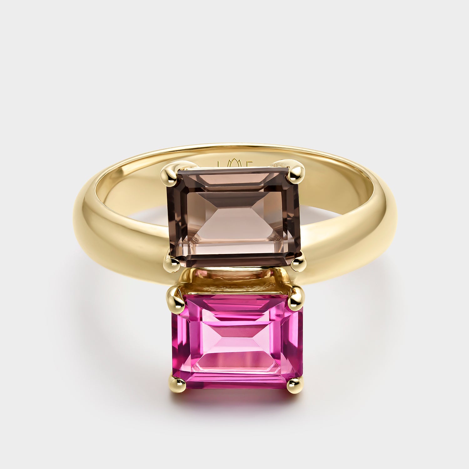 Este anillo de oro amarillo combina la elegancia del cuarzo fumé con la delicadeza del topacio rosa en un diseño octogonal de 8x6 mm. Su armoniosa mezcla de tonos aporta un toque sofisticado y moderno, ideal para realzar cualquier estilo con distinción y sutileza. Perfecto para quienes buscan una joya única que refleje buen gusto y personalidad.