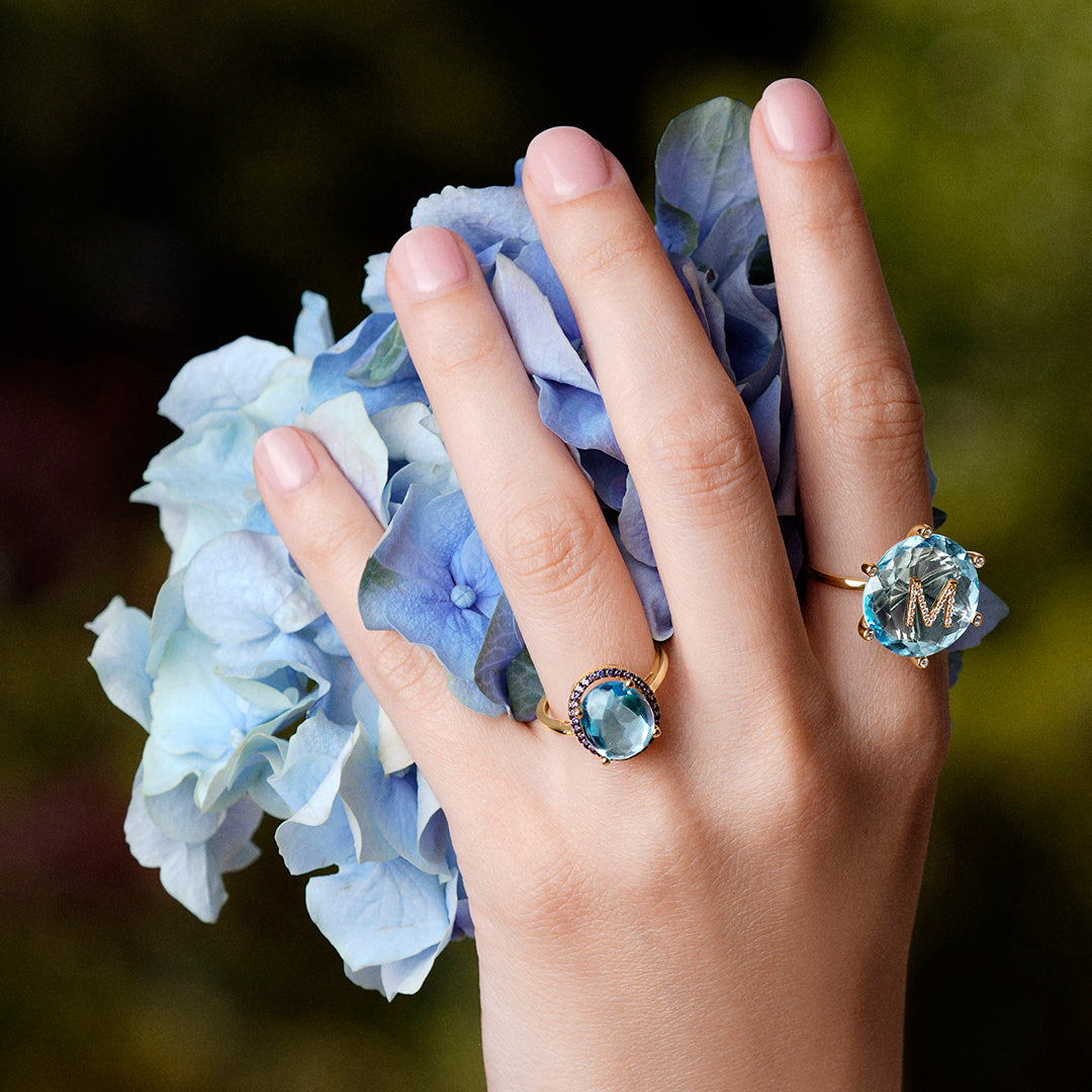 Anillo elaborado en oro amarillo de 18 quilates, protagonizado por un topacio azul swiss oval de 12x10 mm, rodeado de nano-zafiros de 1,10mm que realzan su elegancia.