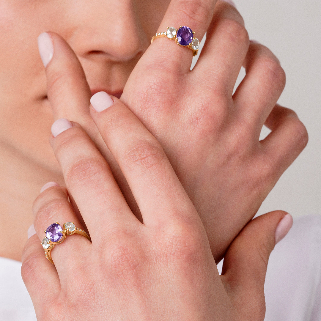 La colección El Jardín Secreto intenta plasmar la fascinación que despierta contemplar la belleza inextinguible del mundo natural. Este anillo en oro amarillo de 18 quilates destaca por su amatista central ovalada de 9*7 con una amatista verde a cada lado de 5*4 y circonitas, una combinación fresca y elegante. Cada joya de nuestro Jardín Secreto realza aquellos rasgos que nos hacen únicos, tendiendo puentes hacia el infinito.
