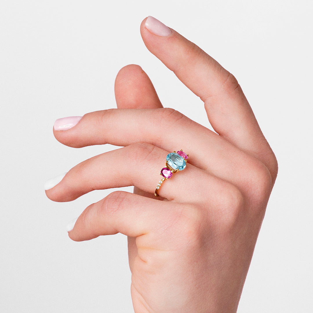 La colección El Jardín Secreto intenta plasmar la fascinación que despierta contemplar la belleza inextinguible del mundo natural. Este anillo en oro amarillo de 18 quilates destaca por su topacio azul central ovalado de 9*7con un topacio rosa a cada lado de 5*4 y circonitas, una combinación fresca y elegante. Cada joya de nuestro Jardín Secreto realza aquellos rasgos que nos hacen únicos, tendiendo puentes hacia el infinito.